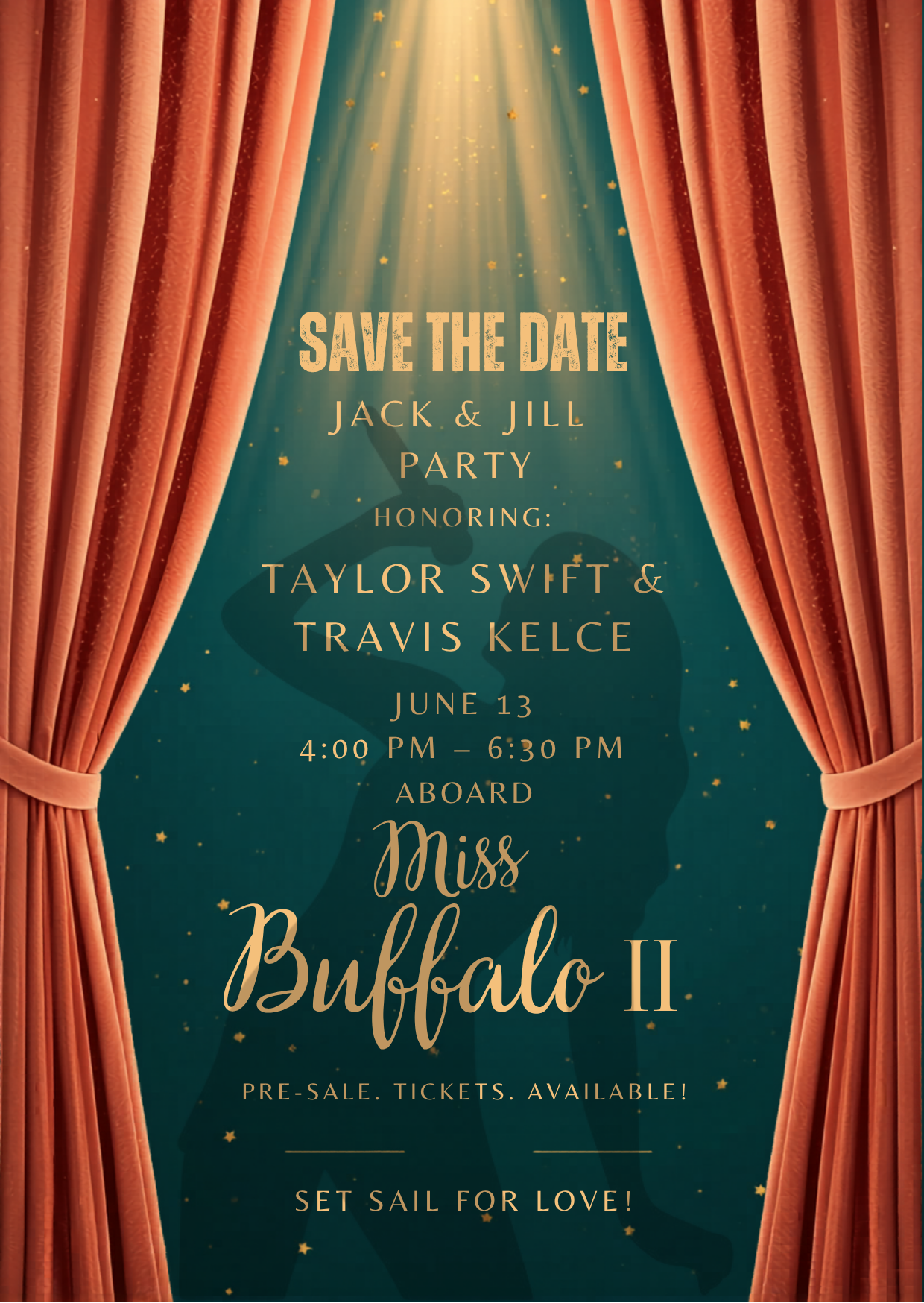 Join us aboard Miss Buffalo II for an unforgettable evening on the water as we celebrate the upcoming wedding of Taylor and Travis. This is no ordinary cruise — this is a full-scale, sequin-studded, spotlight-worthy Jack & Jill party inspired by the dazzling aesthetic of the Showgirl era. Think velvet curtains, golden glitter, and a cruise that hits different when your favorite love story has entered its greatest era — and everyone agrees, we are living in it.